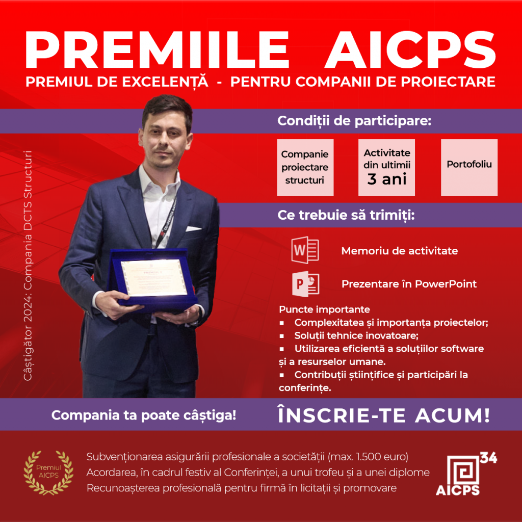 IMPORTANT: Înscrierea la Premiile AICPS este liberă pentru societățile, colectivele de proiectanți de structuri și respectiv tinerii proiectanți de structuri cărora li se adresează, fără a fi impusă condiția ca acești să fie înscriși ca membri persoane fizice sau membri persoane juridice ai AICPS.
