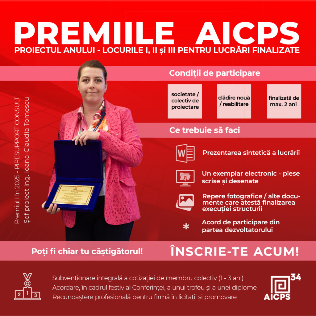 - PREMIILE AICPS Proiectul Anului 2026, pentru lucrările finalizate (construite) în ultimii doi ani sau care au cel puțin structura de rezistență finalizată