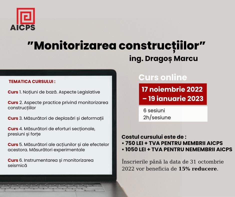 Asociația Inginerilor Constructori Proiectanți de Structuri (AICPS) are plăcerea de anunța organizarea cursului ”Monitorizarea construcțiilor” susținut de domnul ing. Dragoș Marcu.